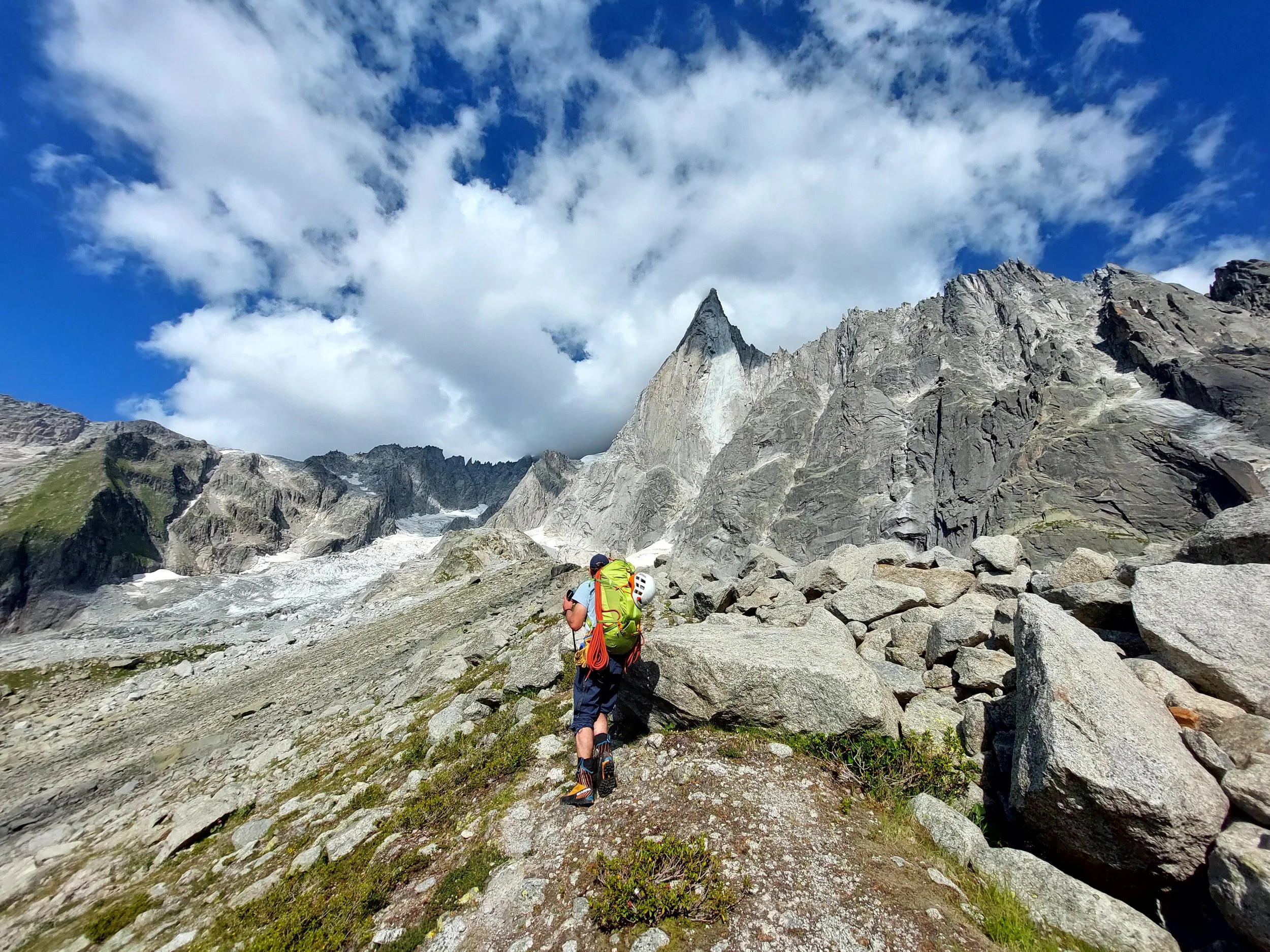 The Dru has had a few attempts at falling over. Two serious rockfall events, in 2005 and 2011, wiped out many lines on the west wall, including the Bonatti Pillar. While the original American Direct has remained largely intact, the upper section of the west face (above the crux corner) isn't climbed anymore, and it's almost always finished via the north face. There is still a real rockfall risk, especially in the lower third.