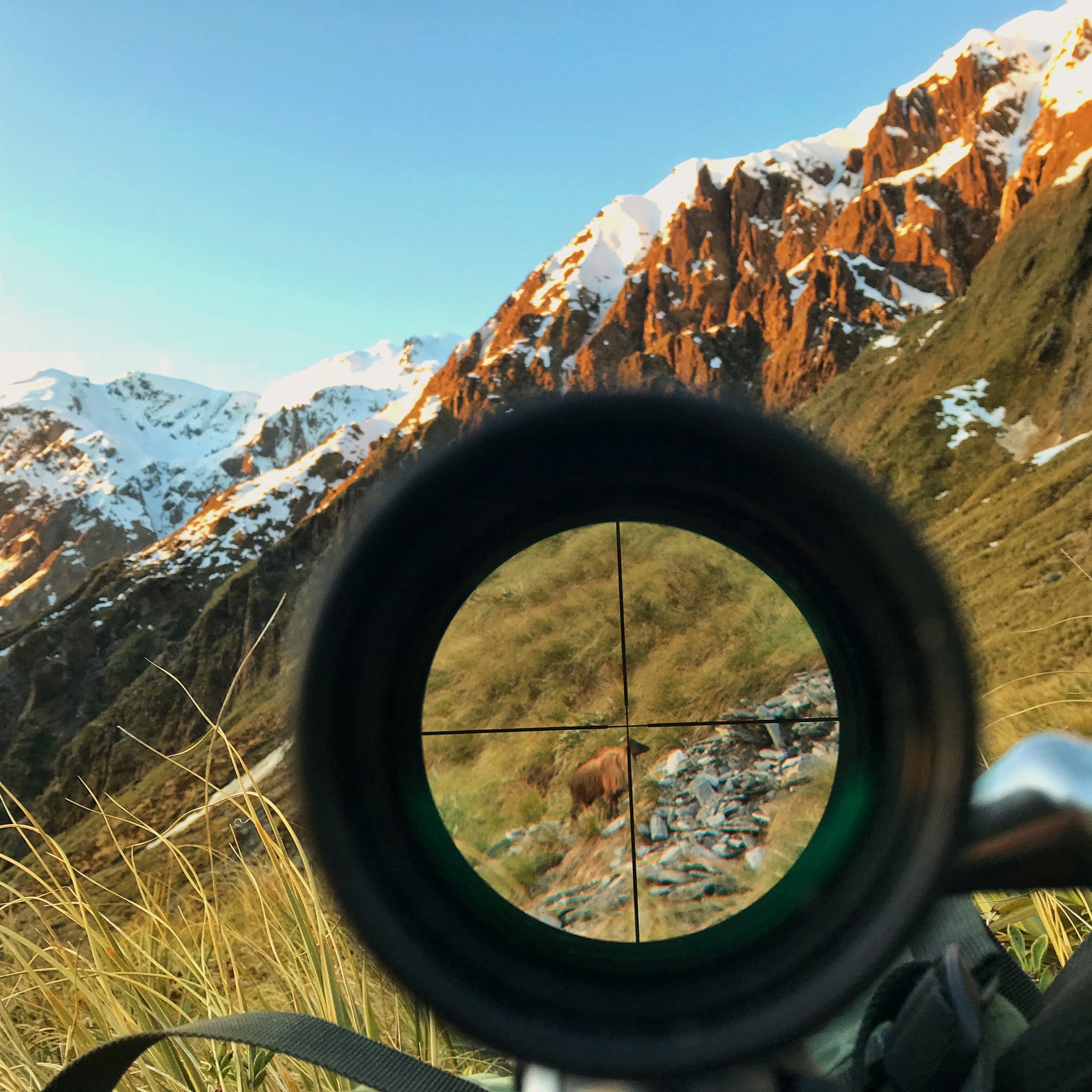 Once in the hut I made some soup and started glassing the nearby bluffs looking for anything that might be making its way down to feed on the grassy shelf before dark. Soon after I saw two bull tahr slowly making their way down a steep section of rock about 500m away. I couldn’t quite size them from this far but made a plan to get closer before it got dark.