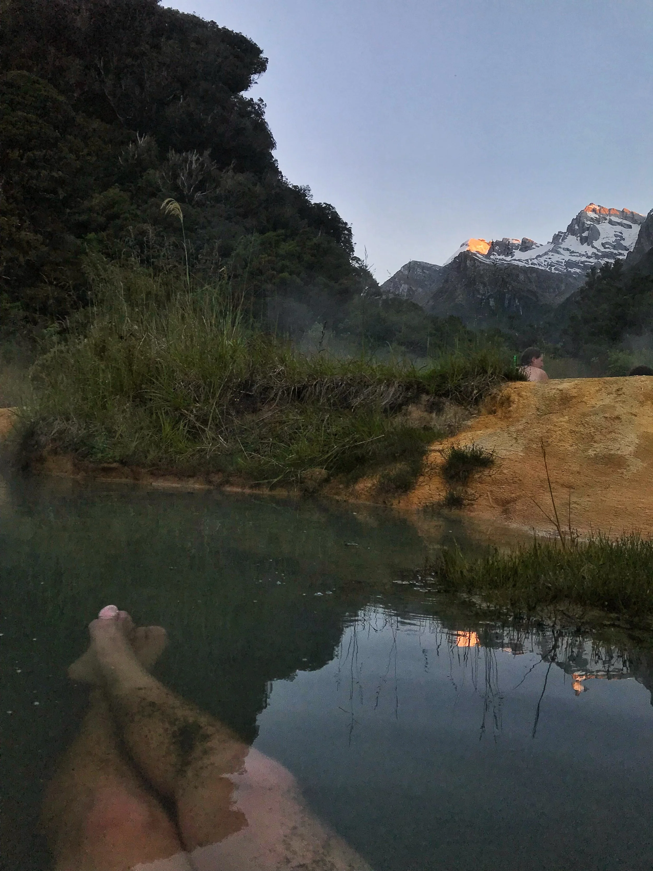 After finding our stashed food at Douglas Bivvy, we made dinner and took our tucker down to the steaming pools. There are a few different thermal pools to choose from, completely natural and tucked in the forest; it was a great end to the big mission. Feeling accomplished, we ate and relaxed while looking back up towards Mt Sefton.