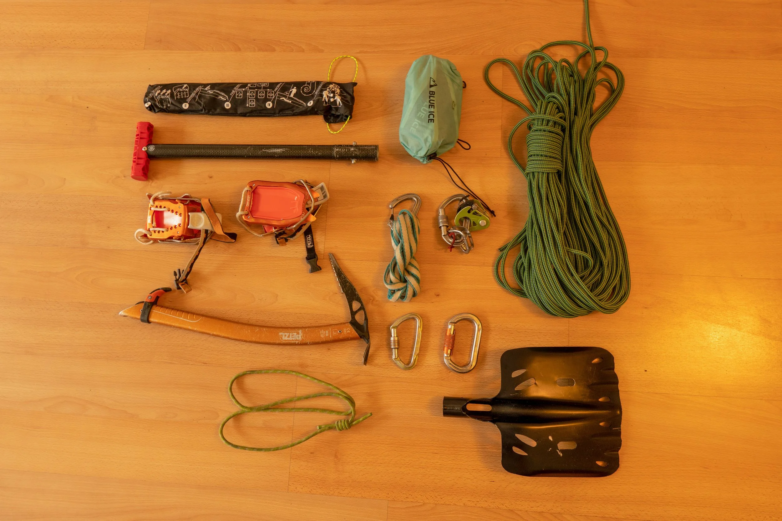 Hardware: ski crampons, petzl gully ice axe, petzl Leopard crampons, Arva race probe, Arva lightweight shovel, blue ice harness, glacier kit (4x carabiners, 120cm sling, tibloc, micro trax), Black diamond vapor helmet.